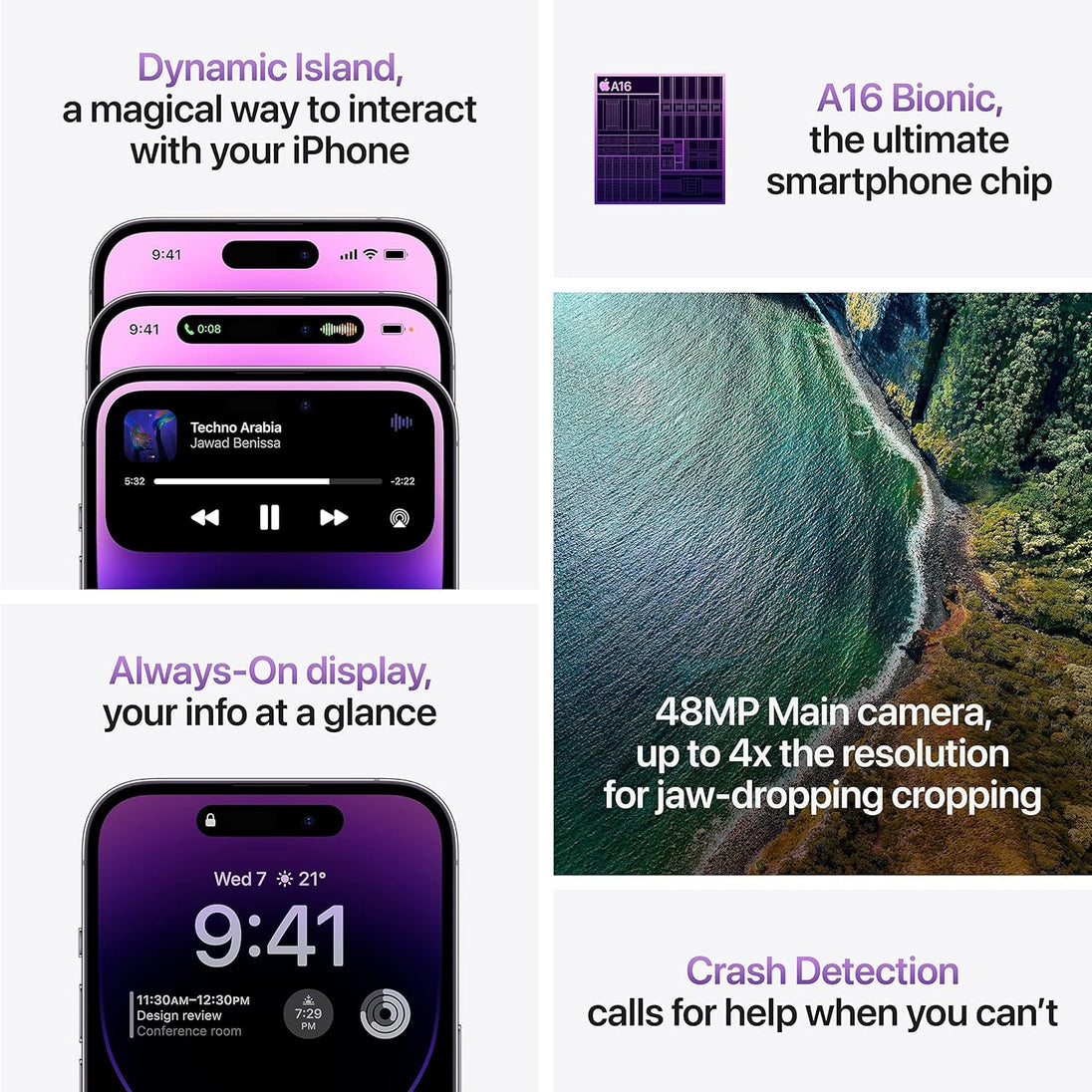 ✅ Dynamic Island: A new interactive experience that adapts in real time to notifications, music, calls, and apps