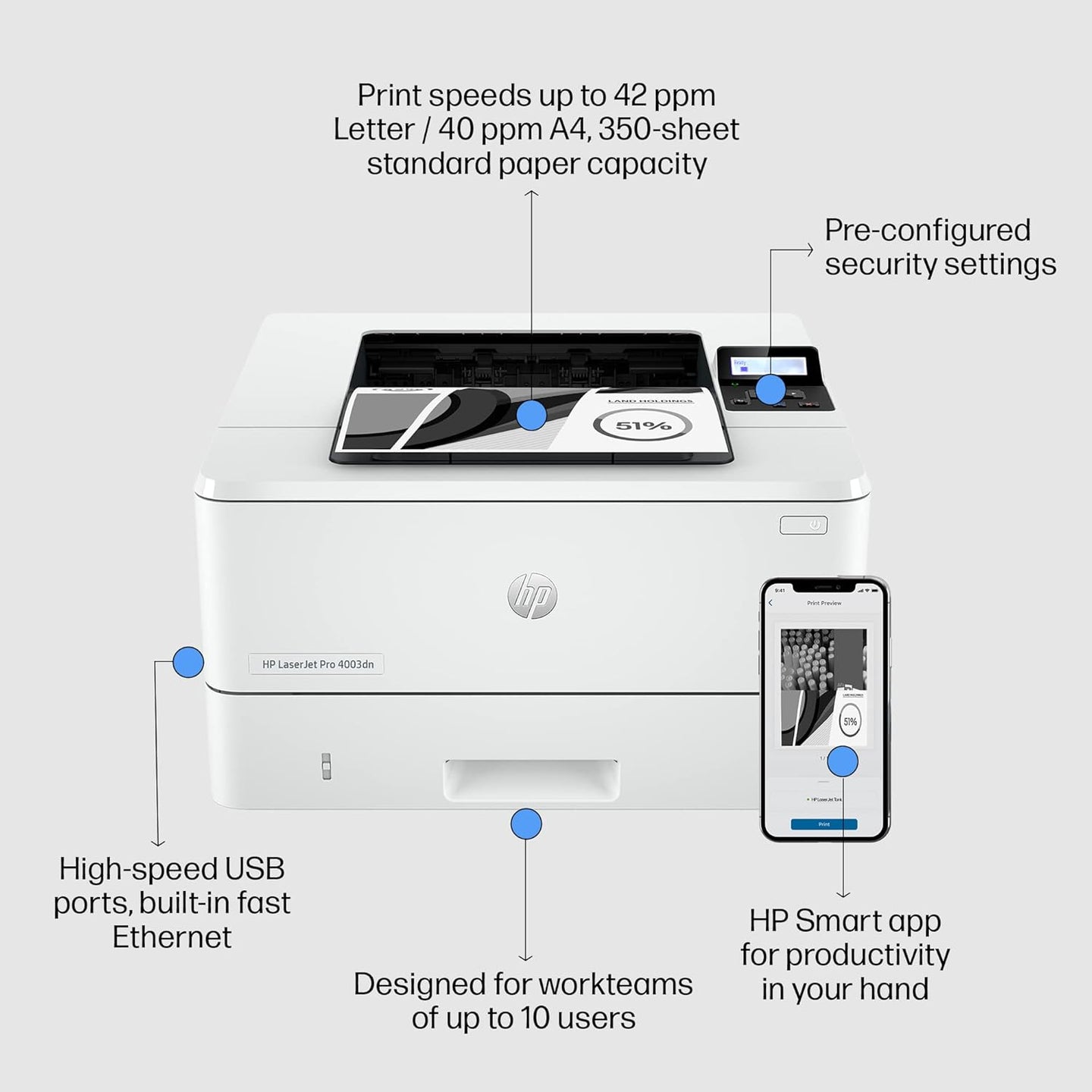 The HP LaserJet Pro 4003dn delivers fast, high-quality printing built for small businesses and professional offices. With automatic duplexing, robust security, and energy-efficient performance, it’s your dependable daily workhorse for crisp black-and-white documents.
